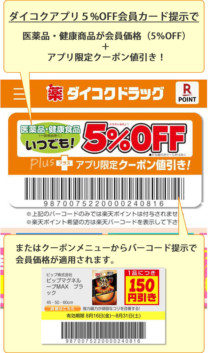 アプリ限定クーポン値引きの対象商品を適用する場合は、ダイコクアプリで5%off会員カード又はクーポンメニューからバーコードを提示して下さい。
